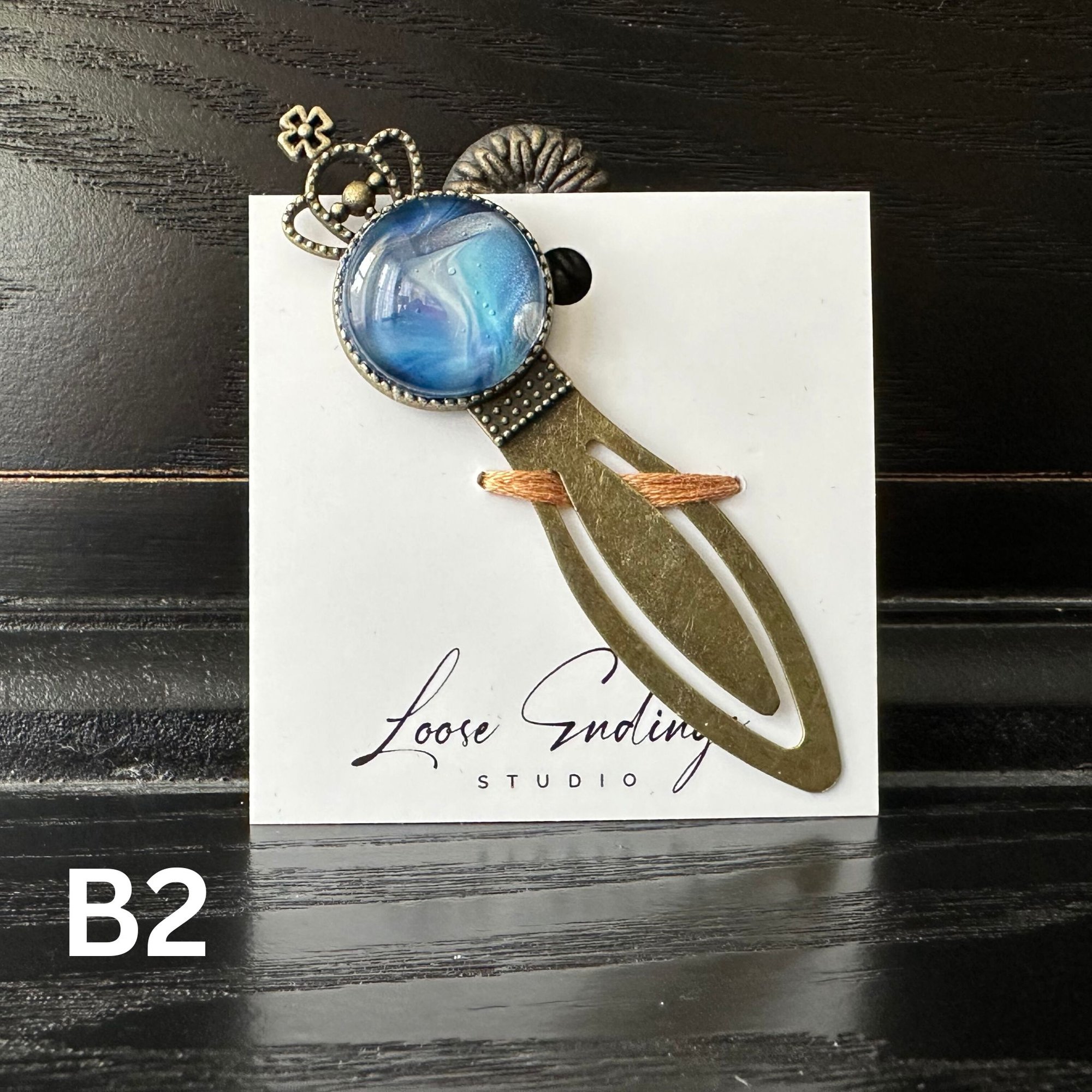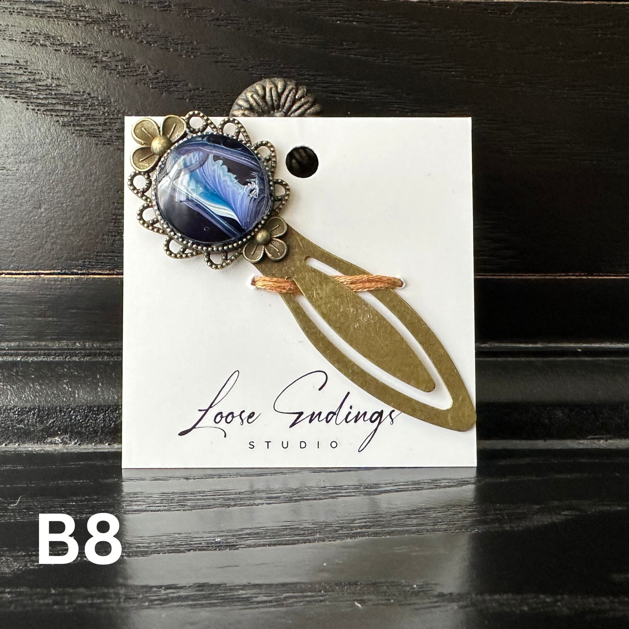 Below the glass cabochon of these bookmarks sit brilliant swirls of color. Each one is a unique design that can not be duplicated.